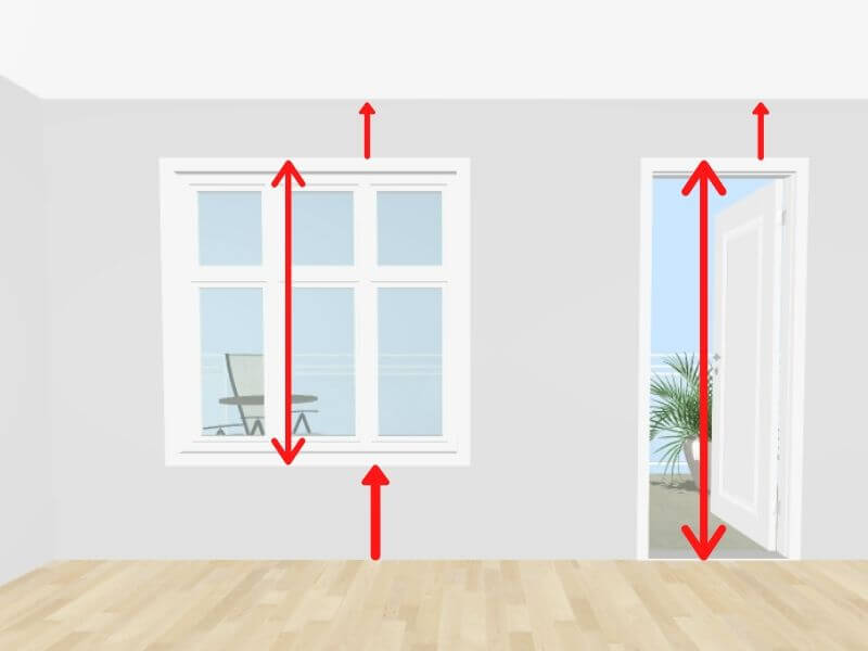 Make a note of where your windows and doors are, and how big they are. First, measure the distance from the corner to the near edge of the opening. Then measure the window or door itself – how wide and tall it is – and, finally, measure the distance from the far edge of the opening to the other end of the wall. These are the horizontal measurements. In the case of windows, you’ll also need to measure the height above the floor and the distance from the top edge to the ceiling (vertical measurements). Ensure you place your tape measure on the floor, not on the skirting board.